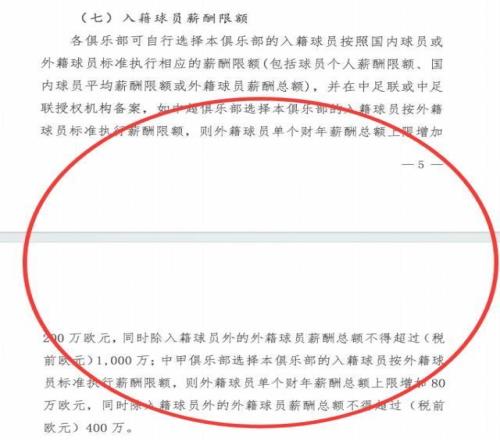如中超俱乐部选择本俱乐部的入籍球员按外籍球员标准执行薪酬限额,则外籍球员单个财年薪酬总额上限增加200万欧元,同时除入籍球员外的外籍球员薪酬总额不得超过(税前欧元)1,000万;中甲俱乐部选择本俱乐部的入籍球员按外籍球员标准执行薪酬限额,则外籍球员单个财年薪酬总额上限增加80万欧元,同时除入籍球员外的外籍球员薪酬总额不得超过(税前欧元)400万。