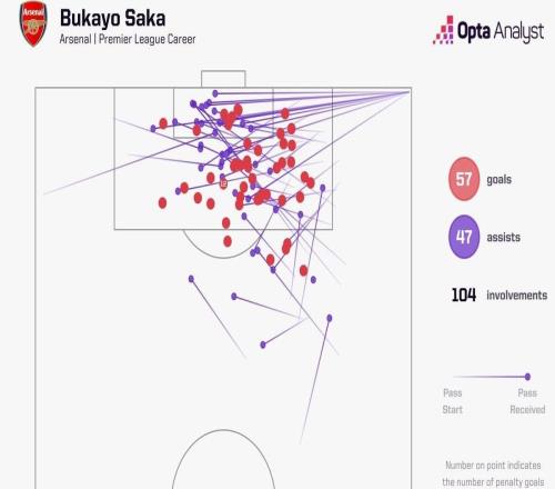 参与104球超越皮雷,萨卡升至阿森纳队史英超参与进球榜第七